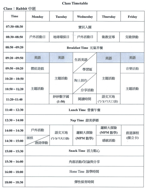 課表跟之前大同小異,除了每天的美語、ㄅㄆㄇ、數字/MPM、主題課、體能、奧福音樂及美陶課外,多了圍棋、唐詩律動和我一直搞不清楚在上什麼但好像很有趣的傑立卡課程