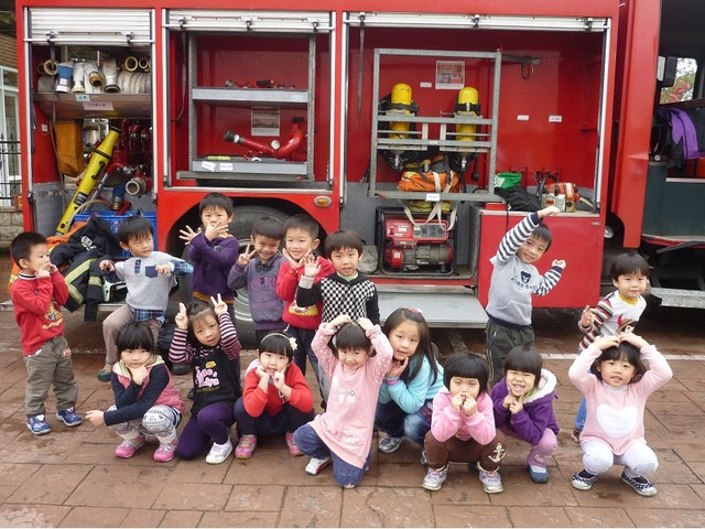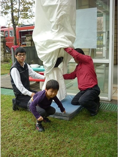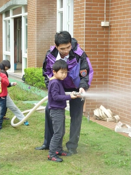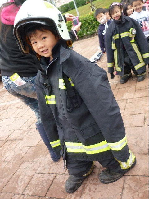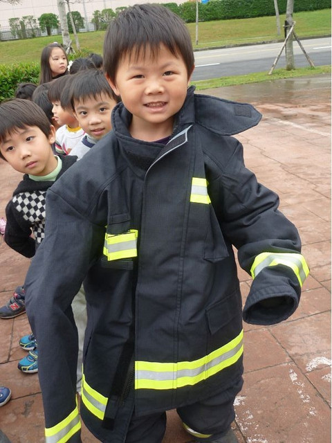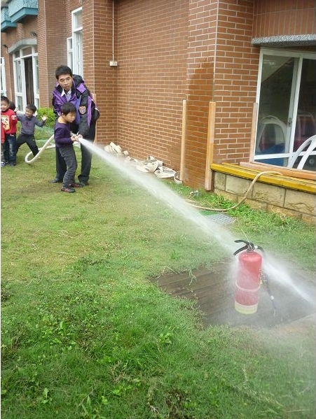 這個月有消防演習,體驗當消防員、滅火、體驗救助袋等樣樣都來,是很特別又好玩的經驗