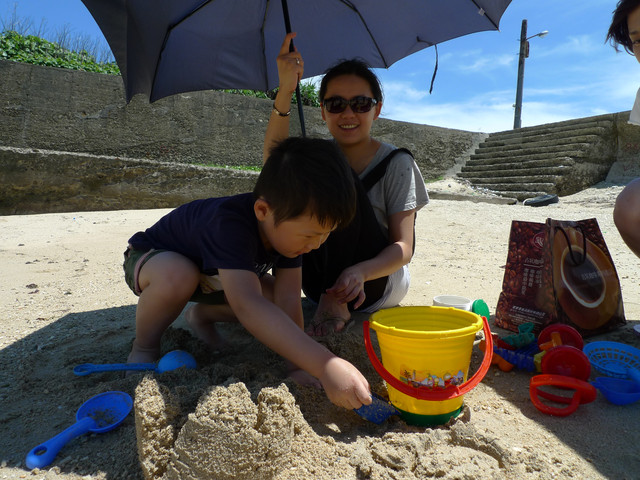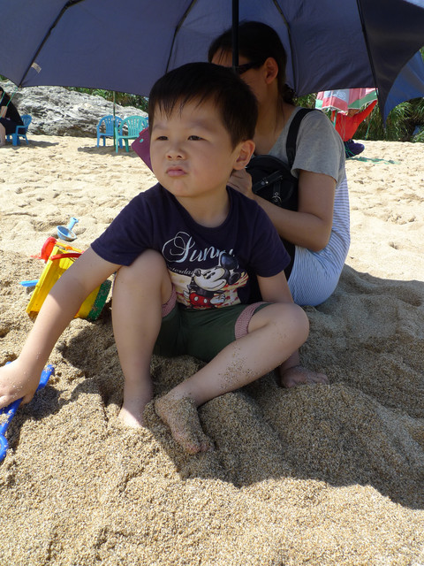 第二天整個下午泡在南灣,三位偽年輕人跑去玩水上活動回來個個唉唉叫,我和小人就躲在陽傘下玩沙,等年輕人回來才帶小人去踏浪...