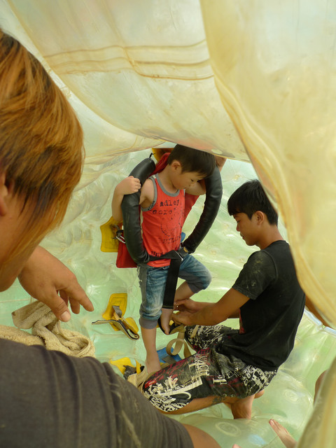這個草地飛球是全台第一座有固定場地的草地飛球場,出發點在山坡上,人員固定在球體內一次可乘坐兩人,順著坡道翻滾而下,這個活動是小人看到momo小玩家被燒到的,當他知道要去墾丁就一直說要玩這個,雖然有年齡限制但業者可能看小勳身高夠高,也讓他上去玩了,下來後小鬼直說好刺激,問他還要再玩一次嗎?小鬼猛搖頭,是說他敢玩已經算不錯了啦,現場有收音,只聽到林爸爸鬼吼鬼叫都沒聽到小勳的聲音,林爸爸的說法是小勳已經嚇傻了XD