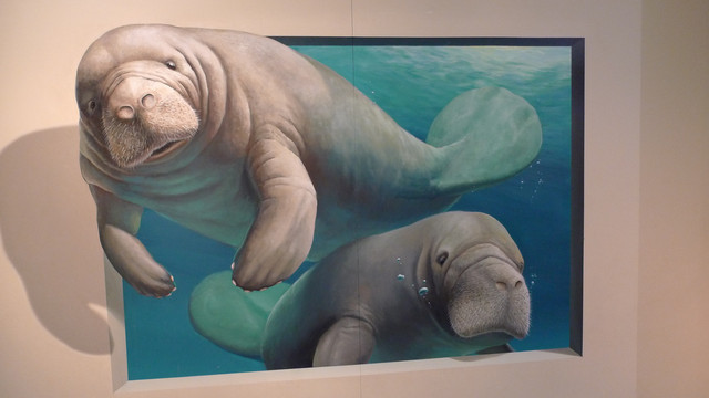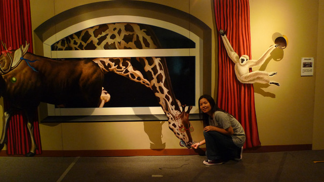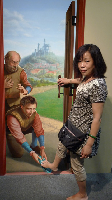 3D幻視藝術運動起源於60年代,藝術家們使用遠近法、陰影法、障眼法等各項繪畫技術,再配合燈光折射與源源不斷地創意,讓觀賞者的視覺與平衡感產生「錯覺」;融合了透視學、設計學、幾何學與心理學的藝術形式。畫展作品分為五大主題:腦力激盪、立體魔幻、森林探險、名畫KUSO及海底冒險,大膽、有創意的作品帶領觀眾走入幻視藝術世界中。可惜我家勳大爺今天心情不怎麼美麗,加上我和外婆在燈光昏暗下的爛拍照技術,照片不多就勉強看看囉!!