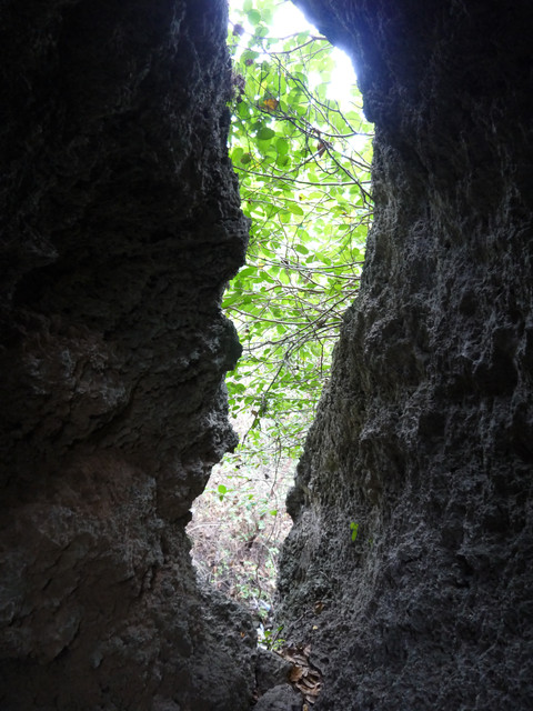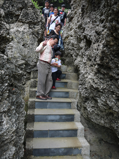 琉球島上珊瑚多屬石灰岩,因此洞穴地形遍佈,最著名的就是烏鬼洞,該洞自古即傳說紛紜,相傳明永曆十五年,明遺臣延平郡王鄭成功,光復台澎,驅走荷人,少數黑奴被棄於此,潛居該洞,洞在岩石隙縫間,俯瞰黯然深黑,不知深長幾許,據傳清時洞中之石桌、石椅、石床、石碗等器皿,尚俱全,銀器、珠寶等亦時有發現,可惜於今洞口塌陷已不能進入...有了美人洞的前車之鑑,加上洞口剛好大塞車,所以我們僅到此一遊而已!!