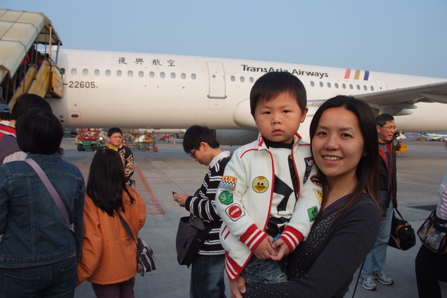 人家清明連假是搶機票返鄉掃墓,我們也跟澎湖人搶機票到澎湖度假,真是不好意思ㄋㄟ:p出發前被嚇唬飛澎湖都是螺旋槳小飛機,還好這一天買到包機的機票,所以還有一百多人的中型飛機,真Lucky!!很少搭國內線的我,還不知道搭機要先搭接駁車到停機坪再上飛機,難得可以這麼近距離跟飛機拍照ㄟ
