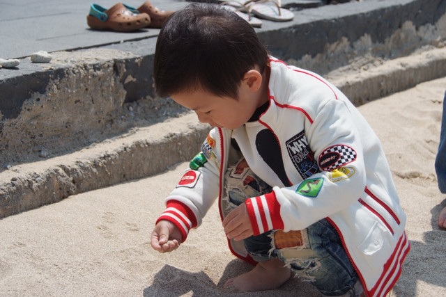 這時候,勳爺也終於睡飽了,醒來睜開眼就吵著要到海邊撿貝殼送老師,於是打亂了西嶼鄉的路線,一路直殺南部的內垵遊憩區踩水撿石頭、貝殼...