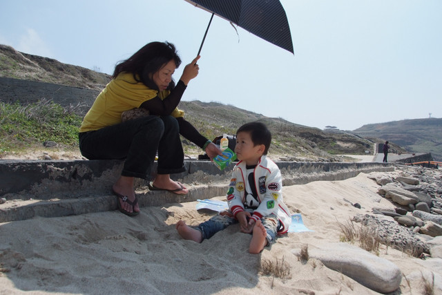 看看小勳多幸福,玩沙有瑪麗亞外婆幫他撐傘遮陽,還要不時遞上水補充水分